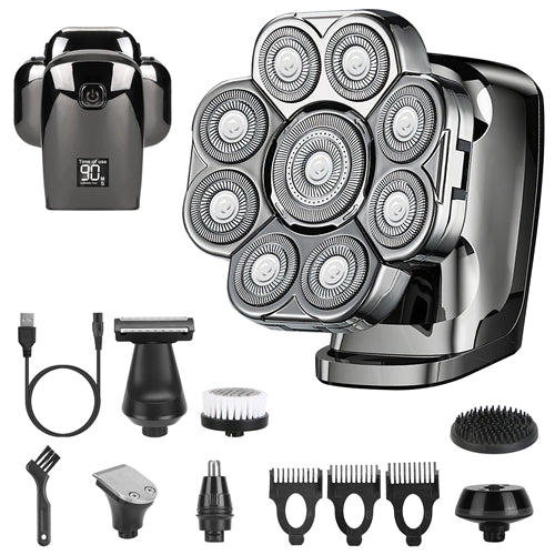 This 6-in-1 cordless head shaver features advanced 9D floating blades for a smooth, close shave every time. Designed for both wet and dry use, it includes multiple grooming attachments for shaving, trimming, and cleaning. The LED display shows battery level, cleaning reminders, stall protection, and a travel lock — perfect for home or on-the-go grooming. Rechargeable and easy to clean, it's the ultimate tool for modern men.